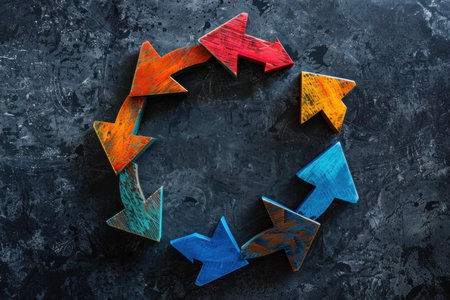 Colorful wooden arrows forming a circle on a dark background representing the concept of circular economy