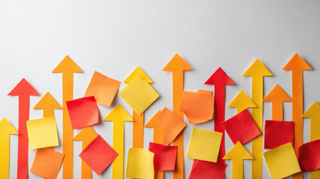 A vibrant display of colorful sticky notes shaped as arrows in red, yellow, and orange, symbolizing growth, creativity, and direction in a workspace.