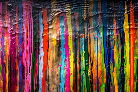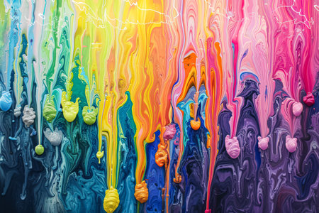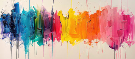 Painting of colorful paint drips with a rainbow effect. The painting is full of vibrant colors and has a lively, energetic feel to it. The colors seem to be splattered and mixed together