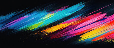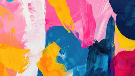 A vibrant abstract background featuring bold and colorful paint strokes. This artwork showcases dynamic patterns and fluid textures in a lively composition.