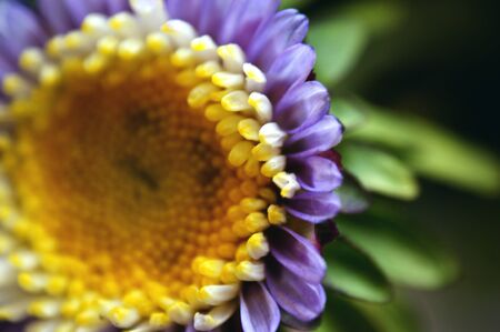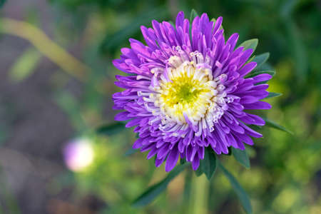 Blue-purple aster flower, close-up. Bright purple aster flower with a white middle in the morning sun. Flowers for the design of flower beds.