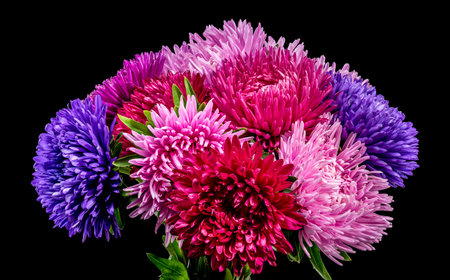 Bouquet of asters Lady Coral isolated on a black background. Flower head close-up