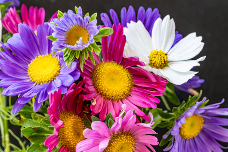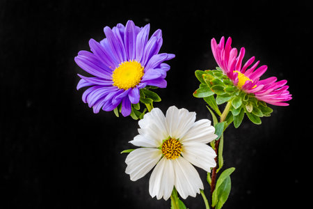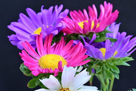 Bouquet of purple daisies and green leaves on a black background. generative ai