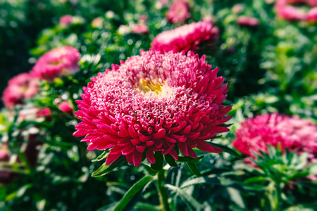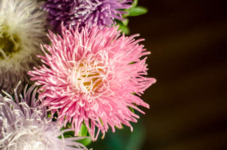 Landscape nature background of beautiful pink Aster flowers in garden. Selective focus.
