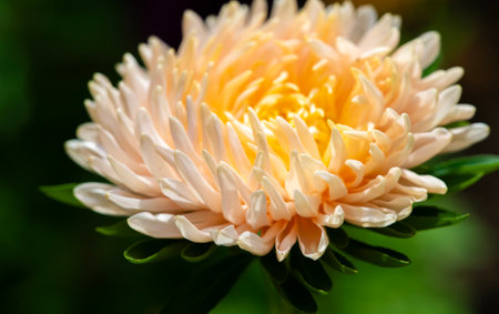 A pale peach aster opens in soft layers, each petal curving gently towards the bloom's golden heart. Subtle shading highlights its intricate form against the lush green backdrop.