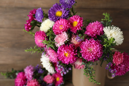 Flat lay composition with beautiful aster flowers on white wooden table. Space for text