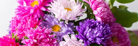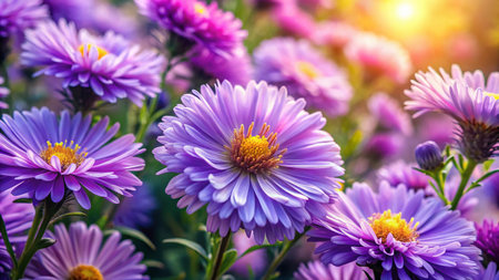 Generative AI : Beautiful flowers macro abstract art background with a soft focus Pink and purple flowers aster in nature on lilac background