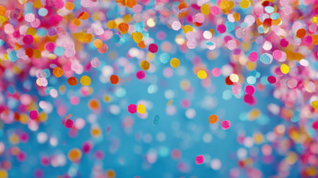 An explosion of vibrant confetti in various colors floats against a serene blue background, creating a joyful and festive atmosphere perfect for celebrations.