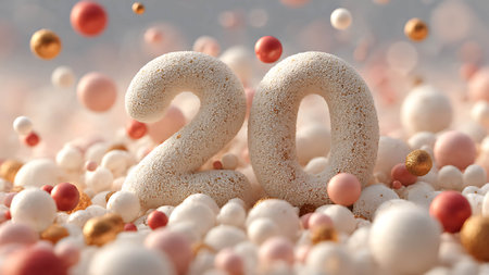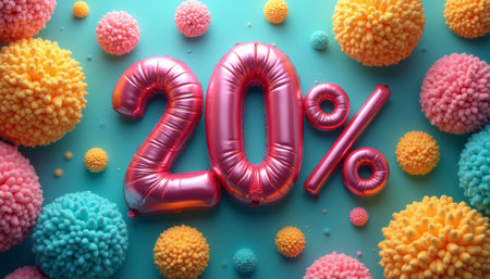 A shiny pink balloon numeral 20 stands out against a bright turquoise background, surrounded by playful, fluffy pom-pom shapes in vibrant orange and teal. This lively composition captures the excitement of a sale, evoking feelings of joy and celebration, perfect for promotional materials.