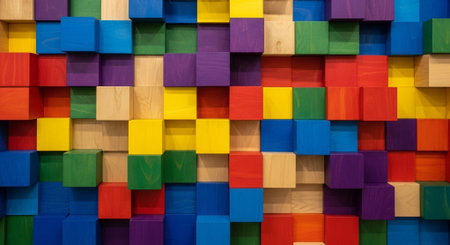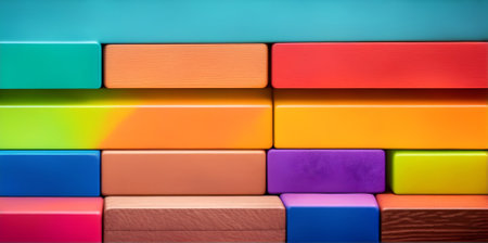 Spectrum of stacked multi-colored wooden blocks. Background or cover for something creative, diverse, expanding, rising or growing. Shallow depth of field.