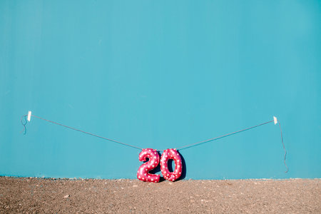the number 20, created with pink heart patterned foil balloons, hangs from a thin red string against a wide blue wall under clear daylight
