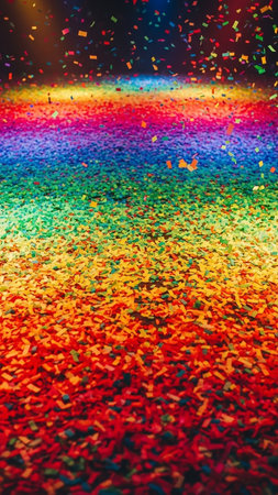 A dense scattering of multicolored confetti blankets the ground, forming a vibrant rainbow spectrum under falling particles and atmospheric lighting.