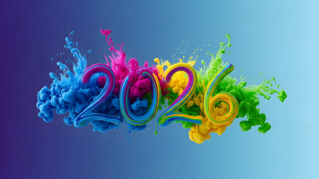 The numbers 2026 are formed by vibrant, colorful ink splashes against a blue gradient background.