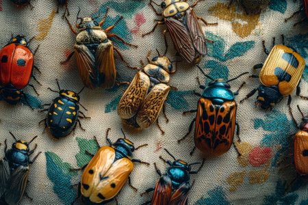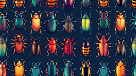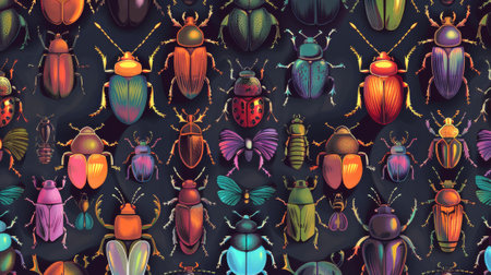 A pattern of colorful beetles with intricate shell designs in various shades of blue, red, and green, forming a fascinating and vibrant background.