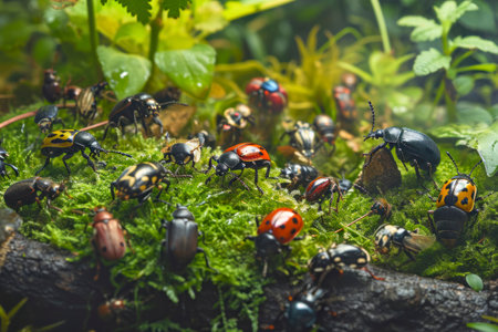 group of colorful beetles on a wooden log, created with generative ai