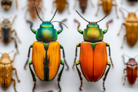 Bright, iridescent beetles with reflective exteriors rest amid a diverse array of insects, set against a clean white backdrop that highlights their vivid colors and intricate textu