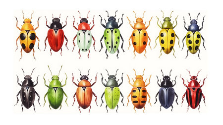 A vivid assortment of colorful beetles displays a variety of unique patterns and textures against a bright background, perfect for studies in entomology.
