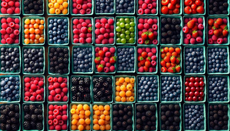 The image features a vibrant assortment of berries and cherries, presented in a visually appealing pattern that emphasizes the diversity of these fruits.