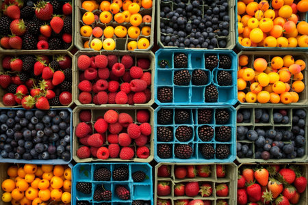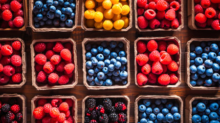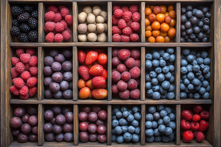 Vibrant assortment of fresh berries and fruits neatly arranged in a wooden compartment, showcasing a colorful spectrum. ideal for concepts related to healthy eating, nutrition, and artistic food presentation. Generative AI