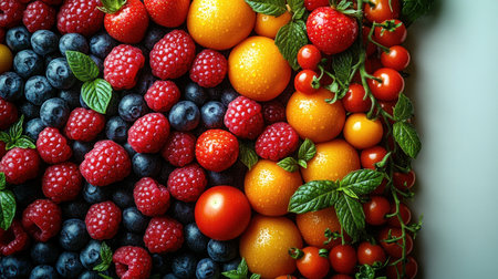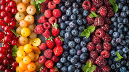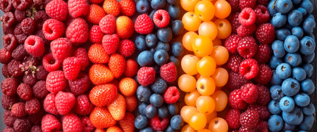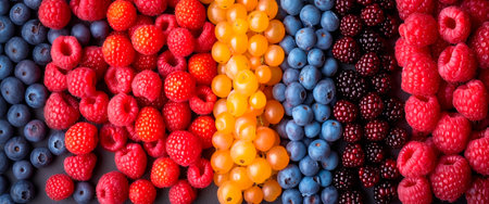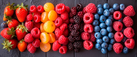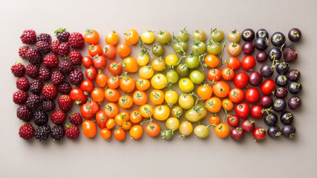 A stunning display of fresh berries and cherry tomatoes arranged in a vibrant gradient. This colorful composition showcases the beauty of natural produce, perfect for culinary inspiration or nutrition-focused projects.