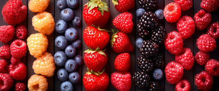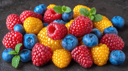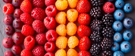 A vibrant display of strawberries, blueberries, raspberries, and yellow raspberries creates a delightful feast for the eyes. This artistic composition showcases the natural beauty and variety of fruits, inviting viewers to indulge in a healthy and refreshing lifestyle.