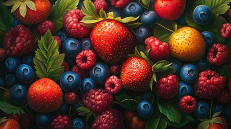 AI generated digital art of a multicolored variety of different fresh berries with leaves on them, rasberries, blueberries, strawberries and cherries