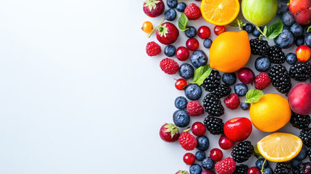 Abstract composition of assorted berry fruits, clustered on a white background, emphasizing their colorful and nutritious appeal.