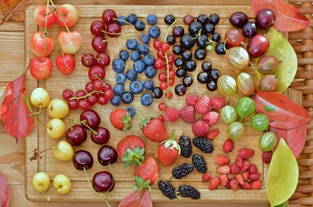 Assortment of fresh berries and fruits in wooden bowls on a colorful background.