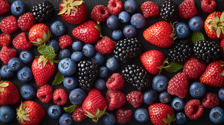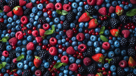 A close-up of assorted berries including raspberries, blueberries, and strawberries. Perfect for themes related to fresh produce, healthy eating, and vibrant colors.
