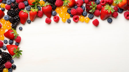 Wild Berries Pile Top View with Copy Space, Juicy Summer Garden Berry Banner, Many Wild Forest Berries Mockup, Abstract Generative AI Illustration