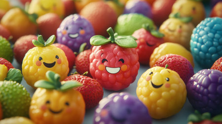 A vibrant collection of cartoon fruits with smiling faces. The playful characters include raspberries, strawberries, and more in bright colors, perfect for children's themes.