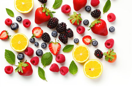 A stunning flat lay of fresh berries and lemon on a colorful background. Perfect for conveying health, nutrition, and vibrant flavors in food photography.