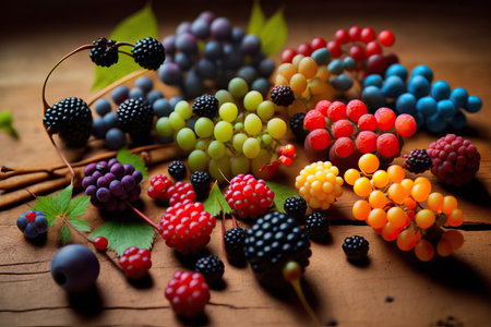 Colorful berries on a wooden background. Selective focus. Shallow depth of field. Toned. (Ai generated)