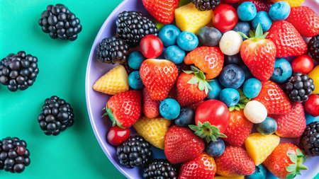 Colorful mix of fresh summer berries on a purple plate against a turquoise background.