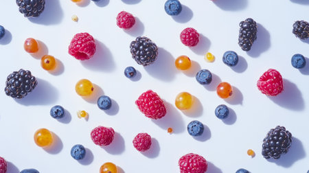 Close-up of different types of berries, creatively grouped together in an abstract style on a white background, highlighting their freshness and vibrancy.