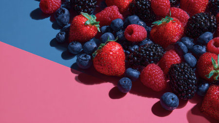 A vibrant arrangement of fresh blackberries, strawberries, blueberries, and raspberries on colorful backgrounds. Ideal for healthy lifestyle concepts and culinary art.