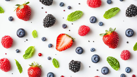 A colorful arrangement of fresh mixed berries showcasing strawberries, raspberries, blackberries, and blueberries on a pristine white background. Perfect for food photography.