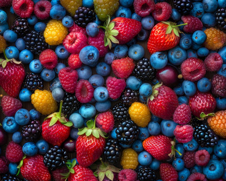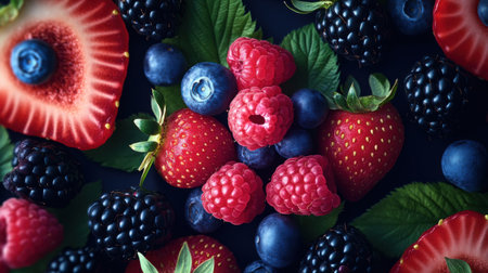 A stunning arrangement of fresh mixed berries including raspberries, blackberries, and blueberries, showcasing vibrant colors and textures, perfect for healthy eating.