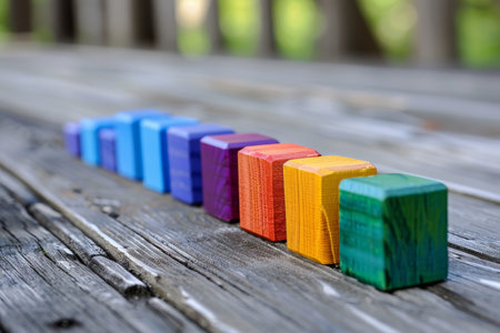 colorful wooden blocks arranged in a gradient formation showcasing bright hues from purple to orange on a white background for educational or decorative purposes