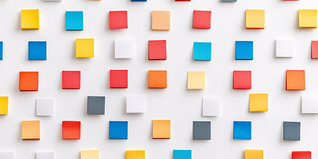 A modern abstract design of scattered colorful cubes on a soft white surface, with gentle light emphasizing the different textures of each cube.