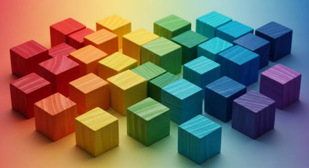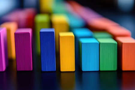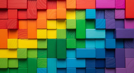 A spectrum of colorful wooden blocks, stacked together, forms a dynamic backdrop representing creativity, diversity, expansion, growth, and depth. Generative AI.