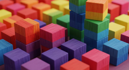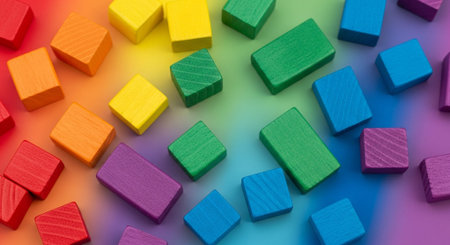 A close-up of colorful wooden blocks arranged on a vibrant abstract background. This image captures creativity, playfulness, and artistic design, ideal for educational materials or decor.