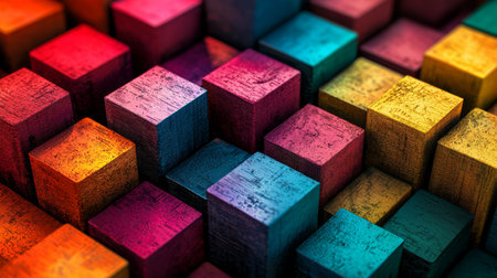 Colorful 3D blocks grouped in a dynamic composition. Vivid, multicolored cubic shapes creating a playful pattern.
