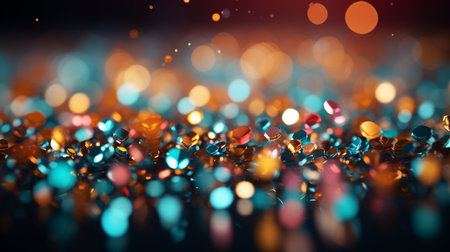Macro shot of shiny confetti with bokeh as background. Generative AI