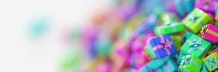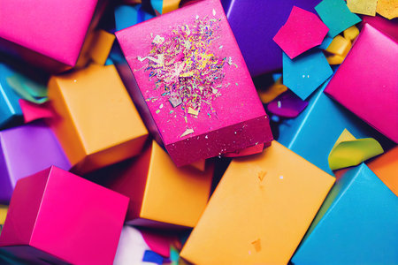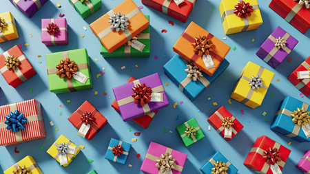 Colorful gift boxes in various sizes are scattered across a flat surface, creating a joyful and festive atmosphere perfect for celebrations.