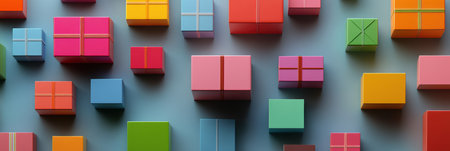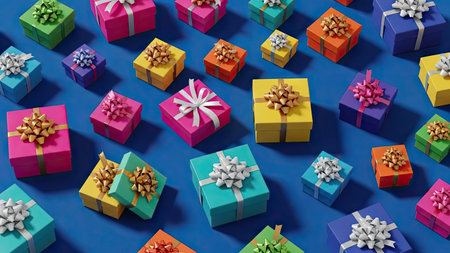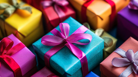 A delightful arrangement of colorful gift boxes with ribbons, set against a vibrant background. Perfect for holiday celebrations, parties, or special occasions.