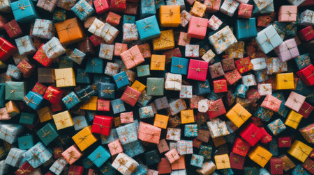 The image showcases a diverse collection of small, colorful gift boxes in various sizes, creating a festive atmosphere filled with joy.