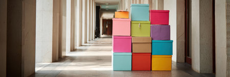 Boxes in various colors are neatly arranged in a hallway filled with natural light, creating a vibrant atmosphere.