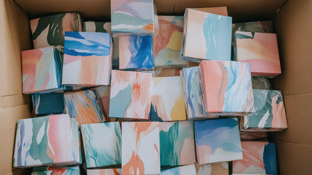 A collection of colorful abstract art papers stacked in a cardboard box, ideal for art projects, DIY crafts, and creative endeavors. The vibrant patterns and textures offer inspiration for various artistic applications.