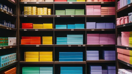 Rows of colorful boxes in a retail store, neatly stacked and organized on display shelves.